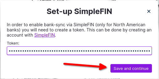 You will be asked to enter your SimpleFIN setup token. The keys from this value will be saved on the server, so you will only need to enter it once.