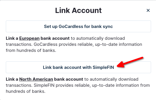 Click “Link bank account with SimpleFIN”.