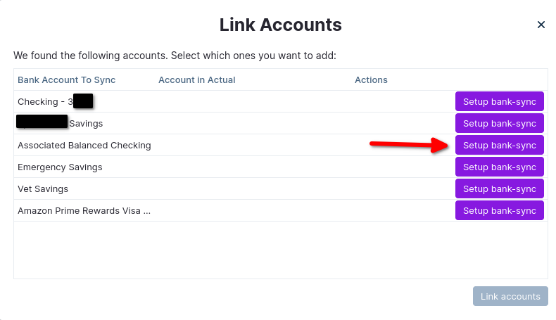 A Link Accounts box will pop up. To link a SimpleFIN account to an Actual account, click the "Setup bank-sync" button in the same row.