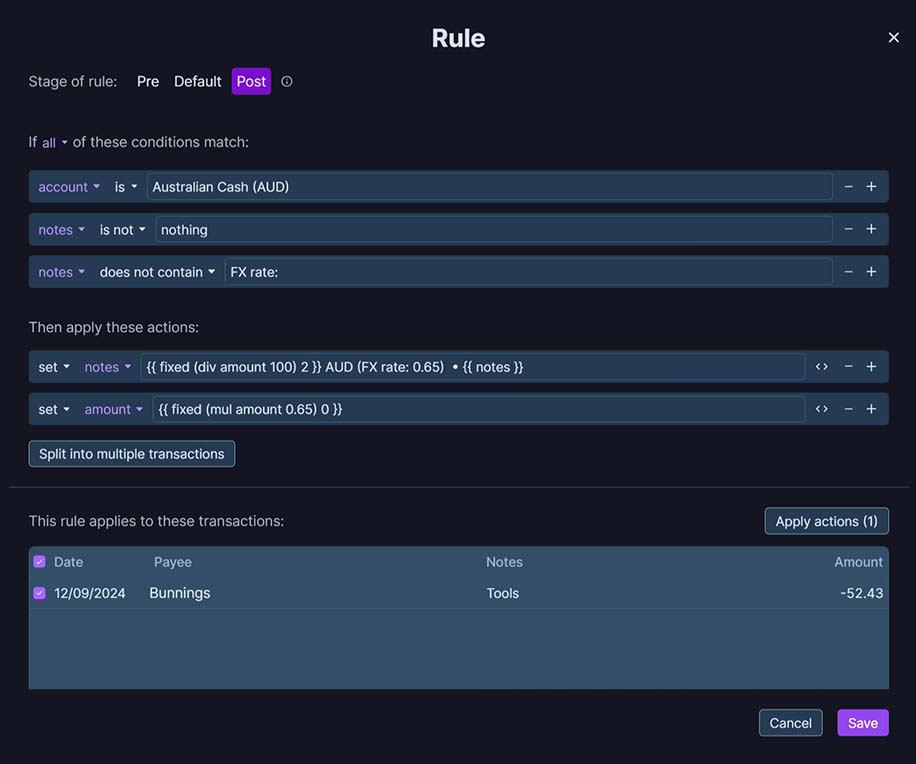 {{ fixed (div amount 100) 2 }}XXX (FX rate: FX_RATE) •{{ notes }}, where XXX is the currency code.- FX_RATE is the exchange rate (i.e., insert 0.65 for 1 AUD = 0.65 USD).