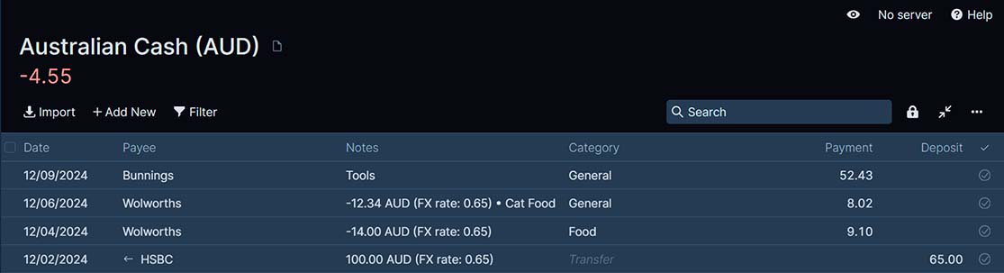 Create a transaction in the foreign currency account using the foreign currency amount. (i.e., if the normal budget currency is USD but the account is AUD, then enter the AUD amount in the Payment or Deposit column).