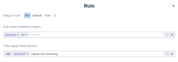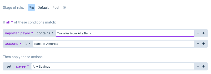 A: Sometimes the payee shows up slightly differently from transaction to transaction. To set the same payee every time and not create a new one every time a new transaction is imported, use a Pre rule that reads the imported payee field and finds the merchant name using a "contains" condition.
