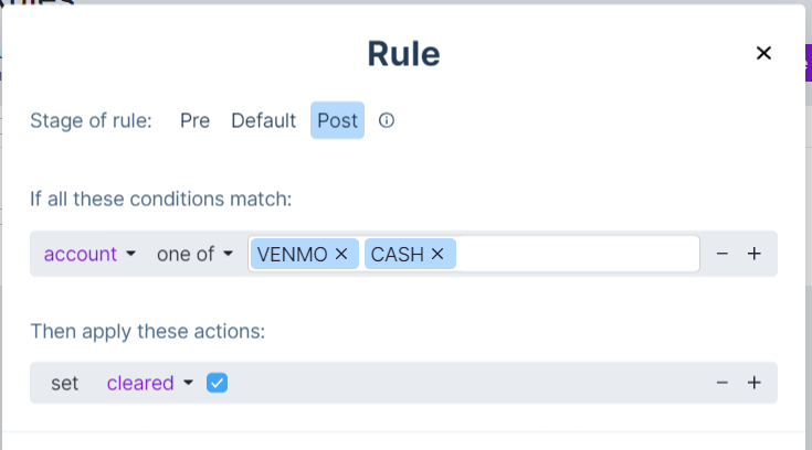 Q: I have accounts (like cash or Venmo) that instantly “clear” at the moment of purchase. How can I automate toggling the "cleared" status?