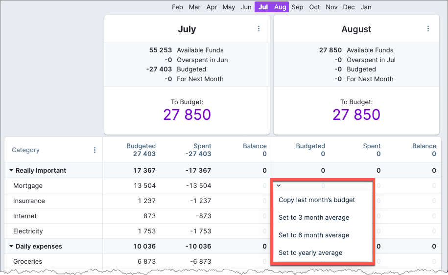 Set aside time to analyze your spending and income at the end of the month. Based on this, you can add values to the upcoming months' Budgeted column.