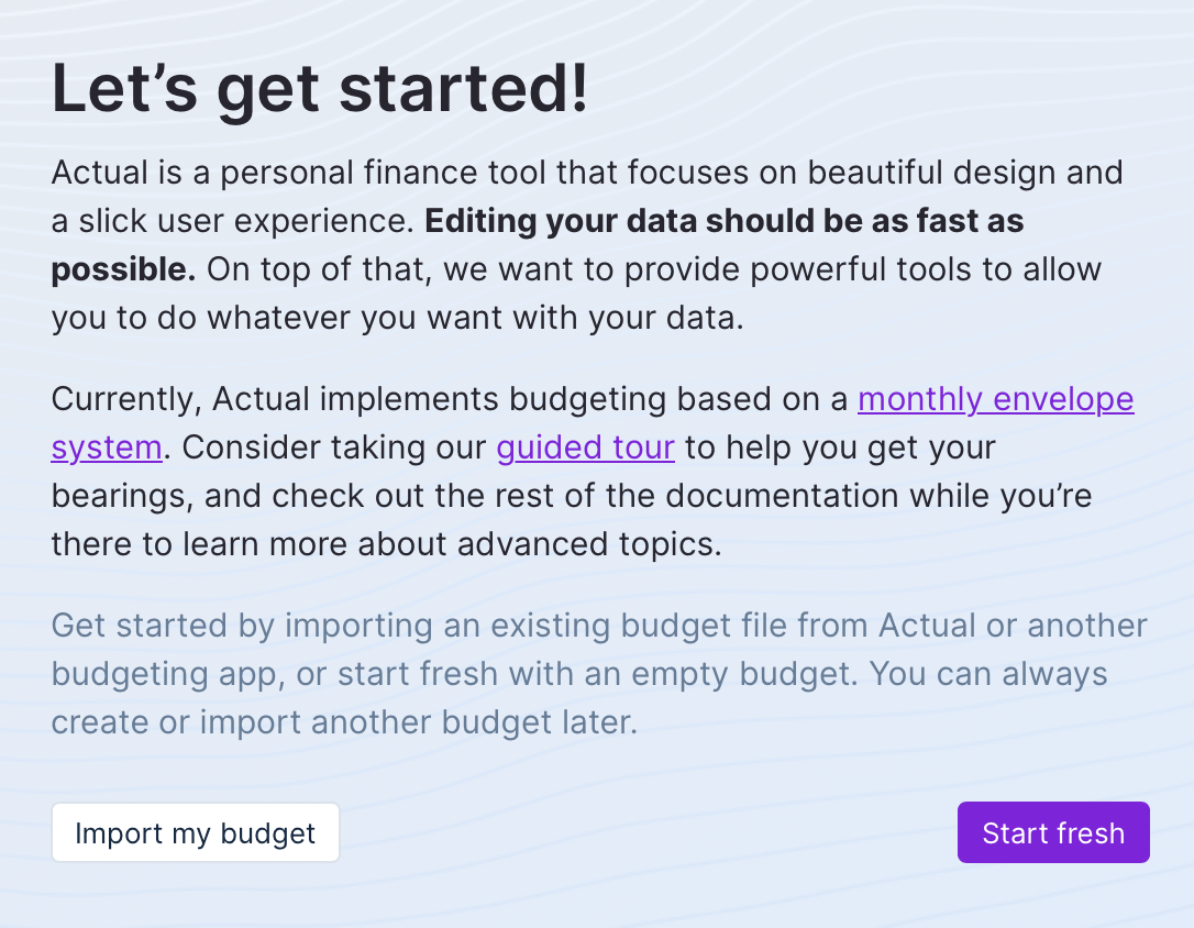 You’ll see a welcome screen. Either click “Import my budget” to import your budget from YNAB or the subscription version of Actual, or click “Start fresh” to create a blank budget file.