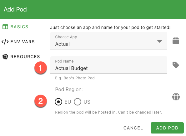 In 1), you enter a name for your Pod. This name really does not matter unless you plan to run several different Pods. In 2), you decide which region your Pod should run - choose the most suitable region.