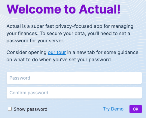 Before you can start using Actual, you need to set a password for your server. This password is used next time you log into your server - and should never be the same as your PikaPods account password.