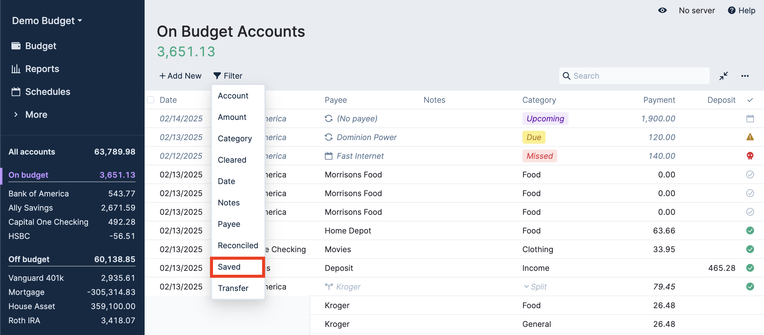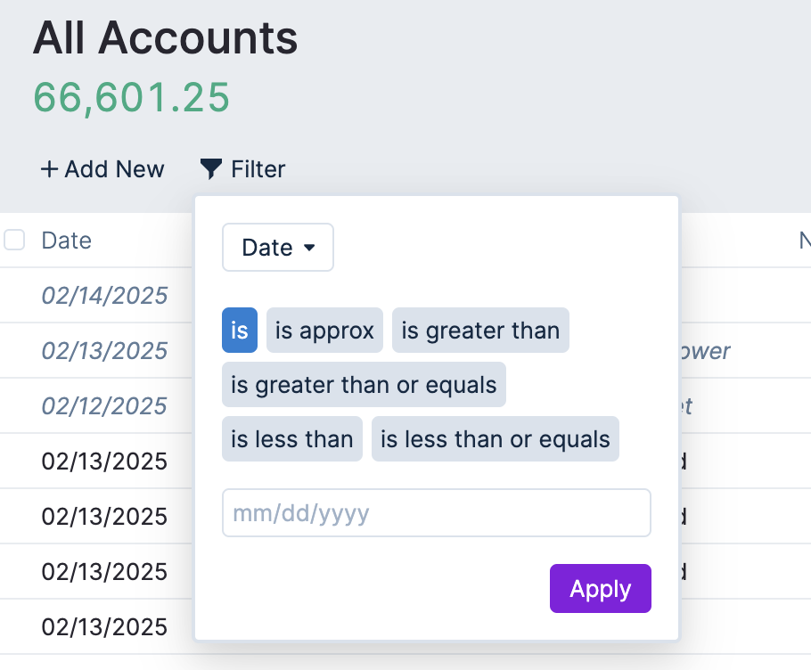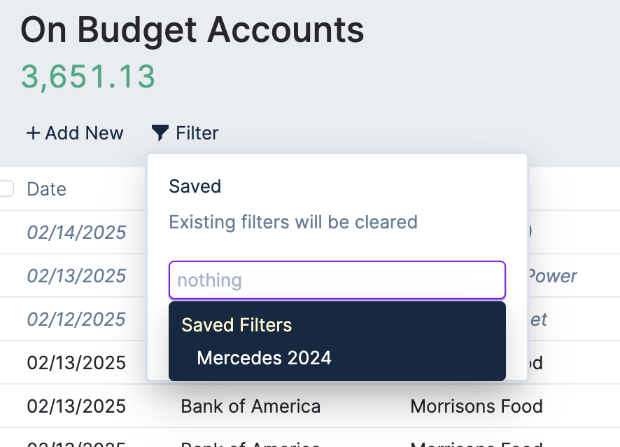 When you want to re-visit a previously saved filter, go to the relevant account page, click on Filter, and select Saved in the dropdown.