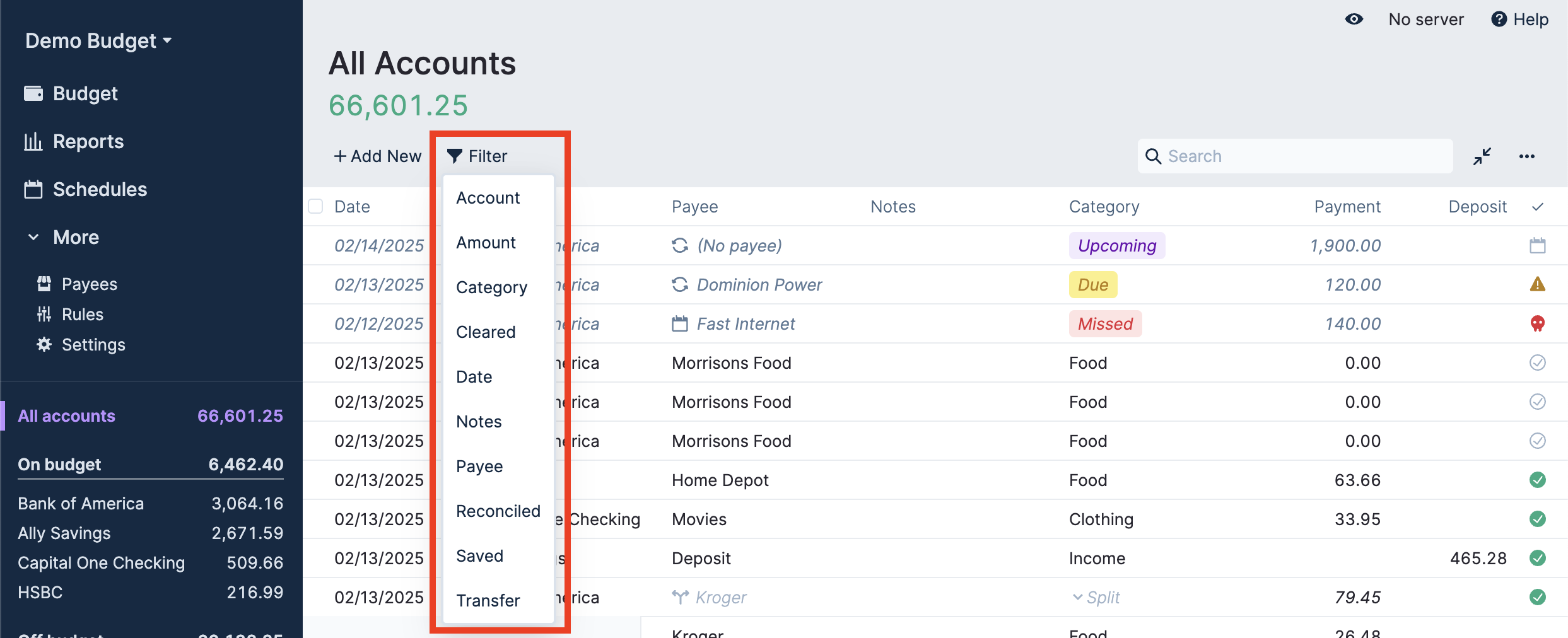 - Split transactions do not behave well in the filtered view. The non-applicable part of the filtered results can end up getting added into the total.