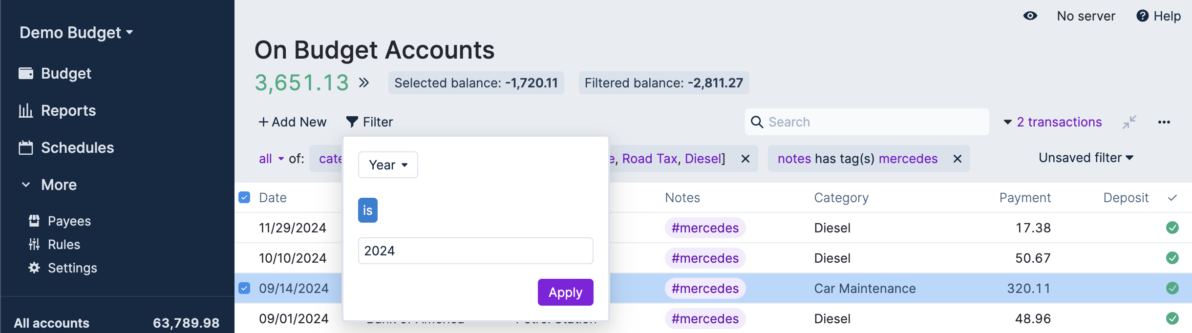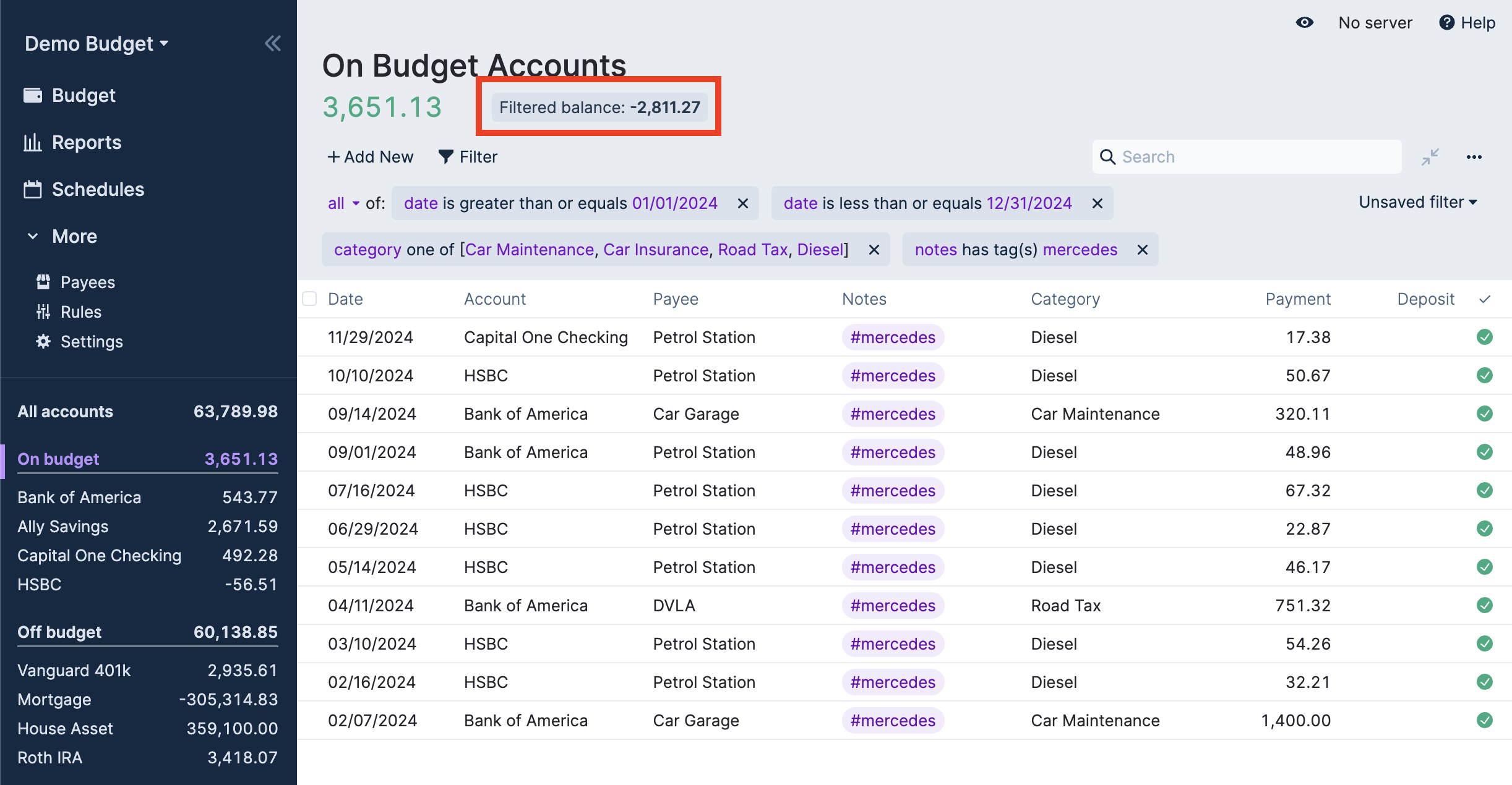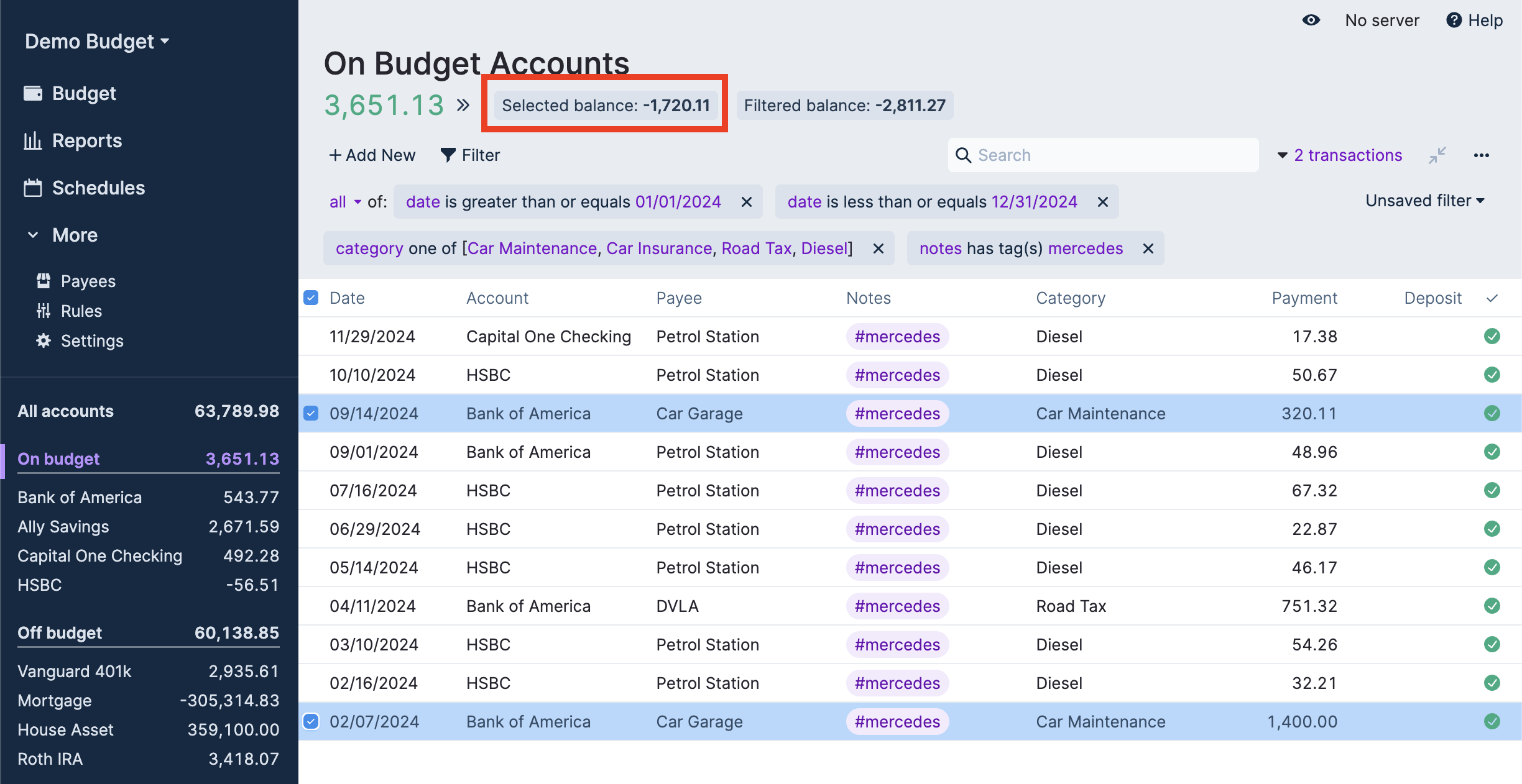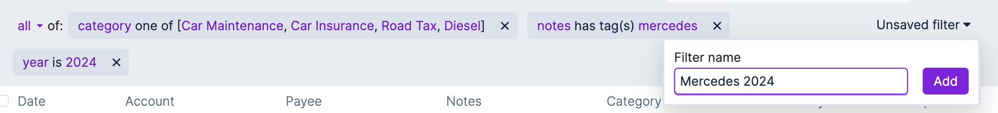 In this example we are finding out how much the Mercedes car cost to run during the 2024 calendar year. To enhance this analysis a tag of each vehicle owned was added to transactions in the “Car” category group. Alternatively, you could just be more granular in your creation of Categories.