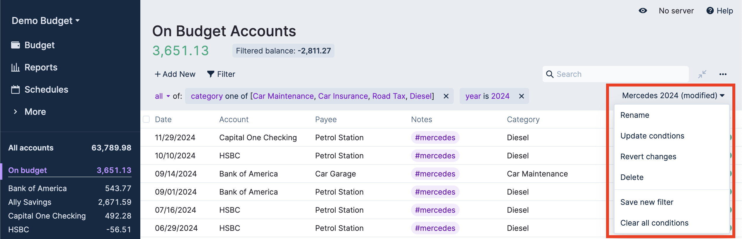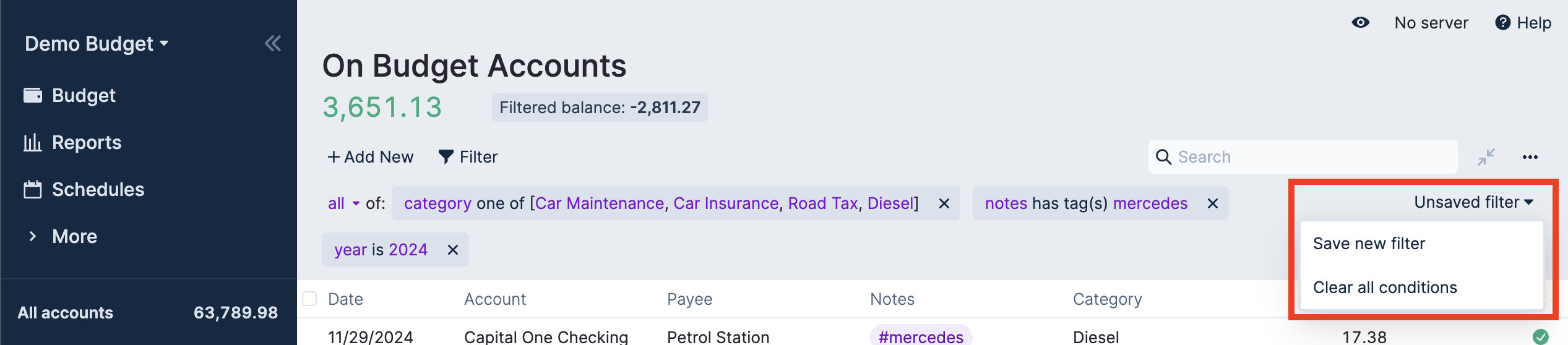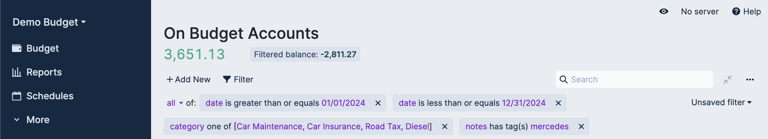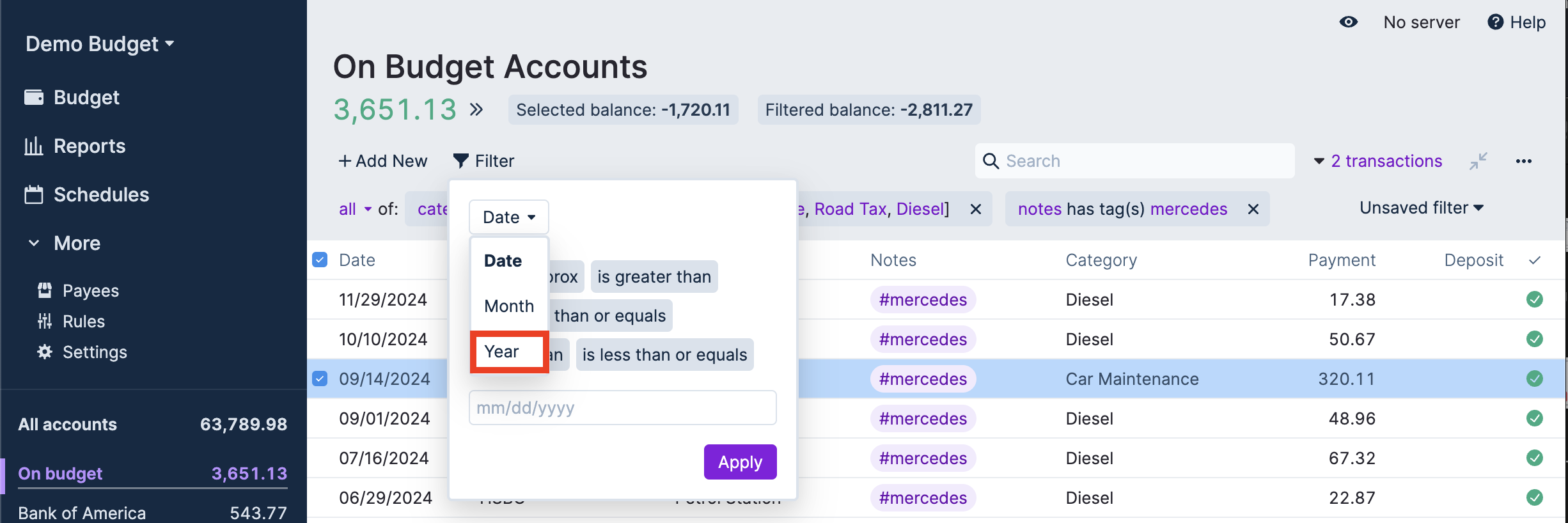 In this example we are finding out how much the Mercedes car cost to run during the 2024 calendar year. To enhance this analysis a tag of each vehicle owned was added to transactions in the “Car” category group. Alternatively, you could just be more granular in your creation of Categories.